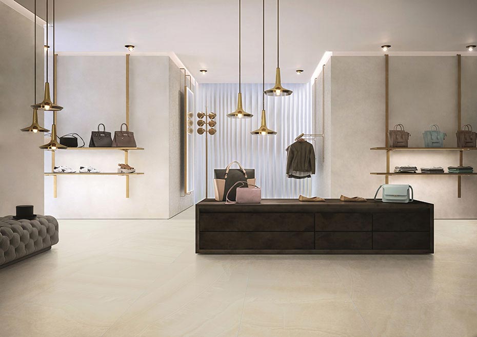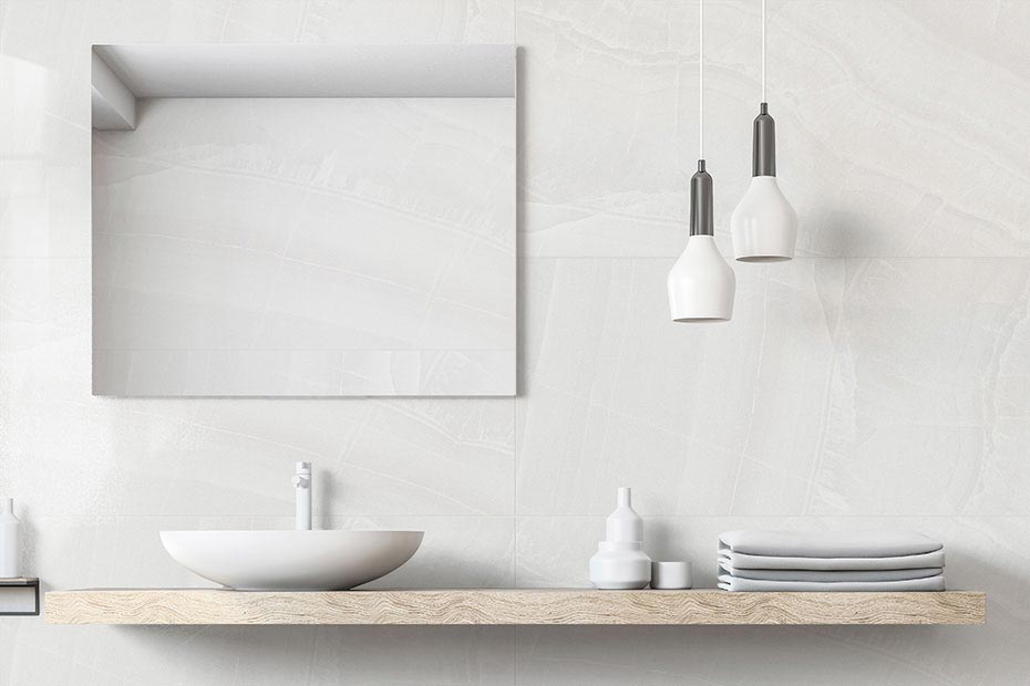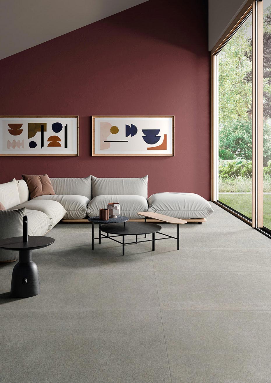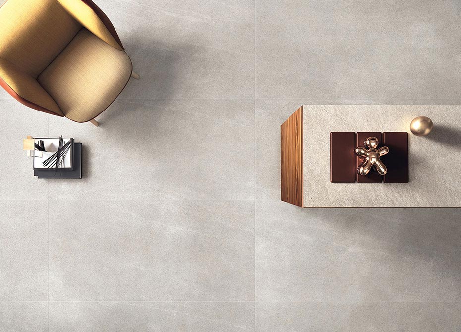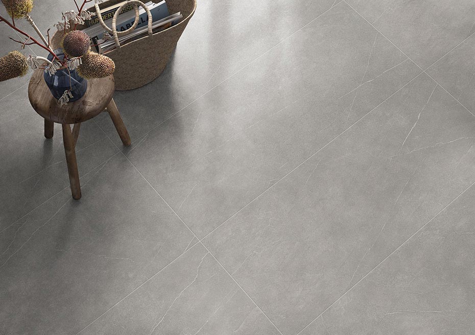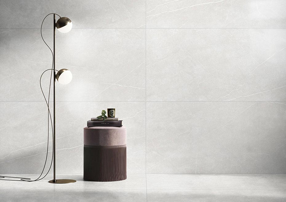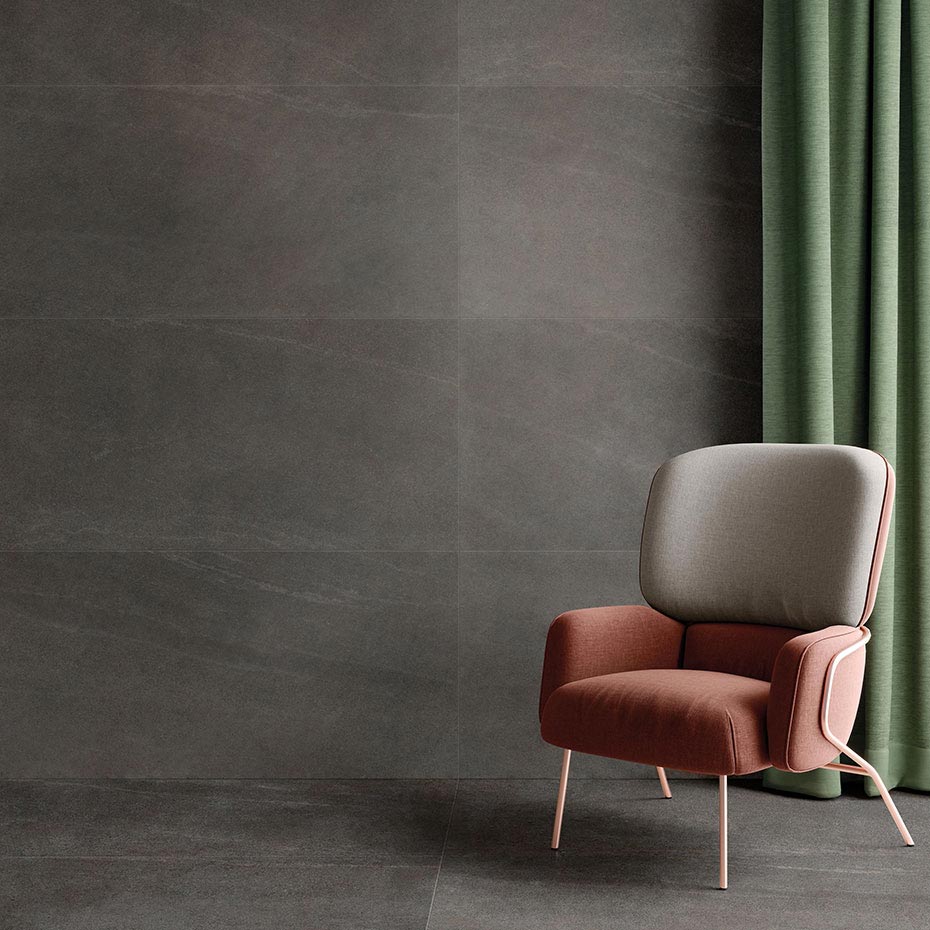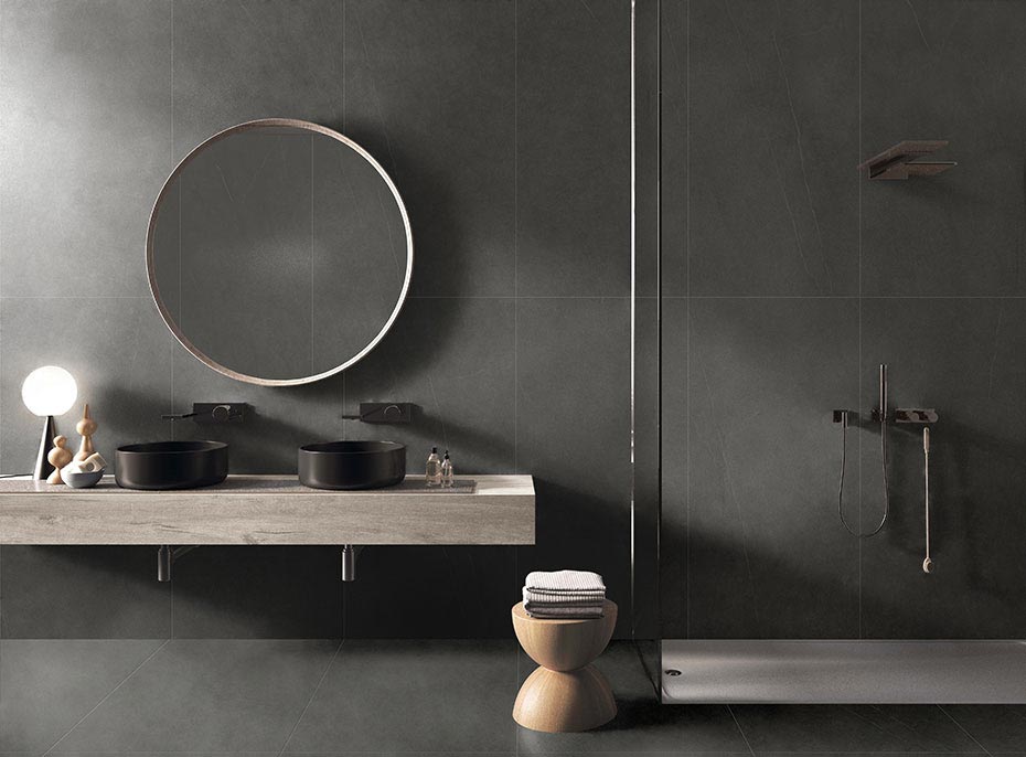 灰色瓷砖的低调姿态,可以让整个空间简约而不失时尚,搭配亮色软装,可以营造出一种简洁明快的现代空间氛围。