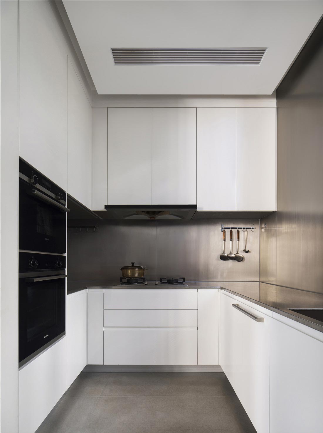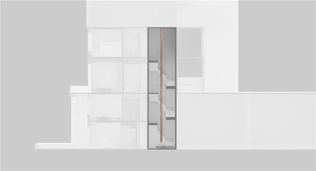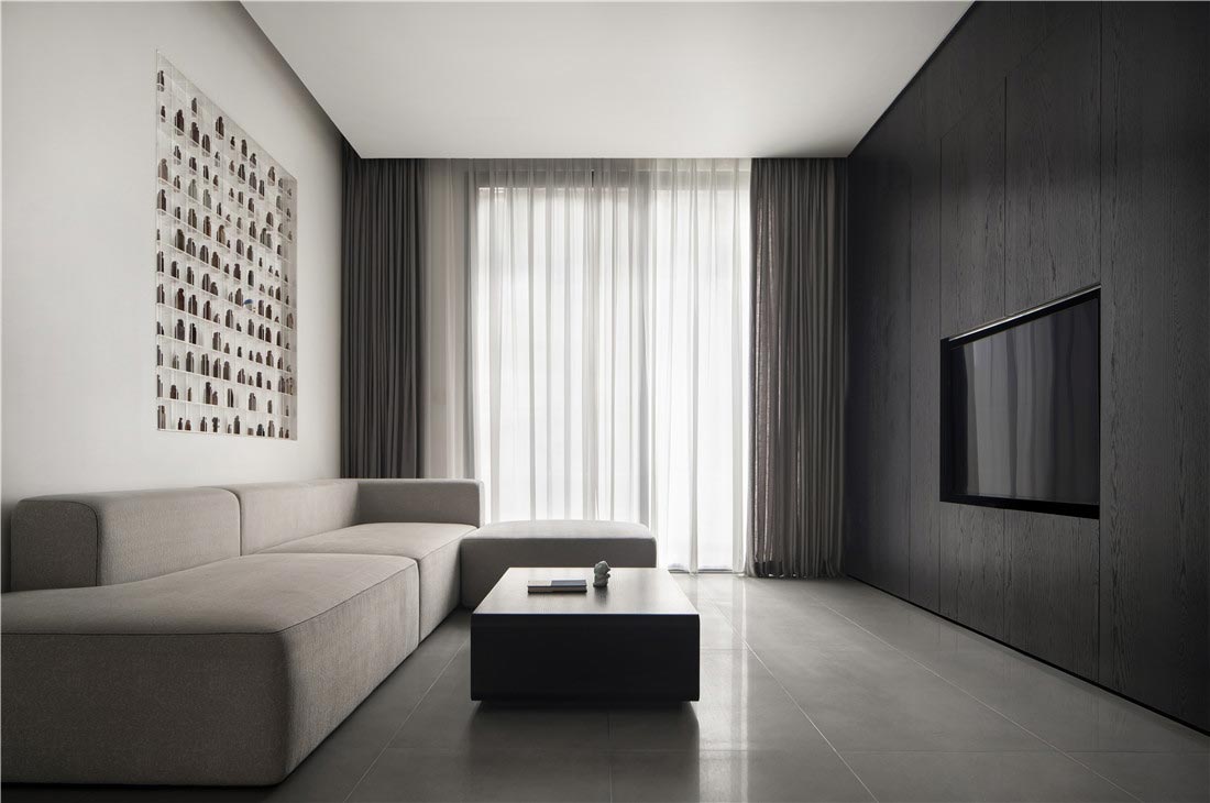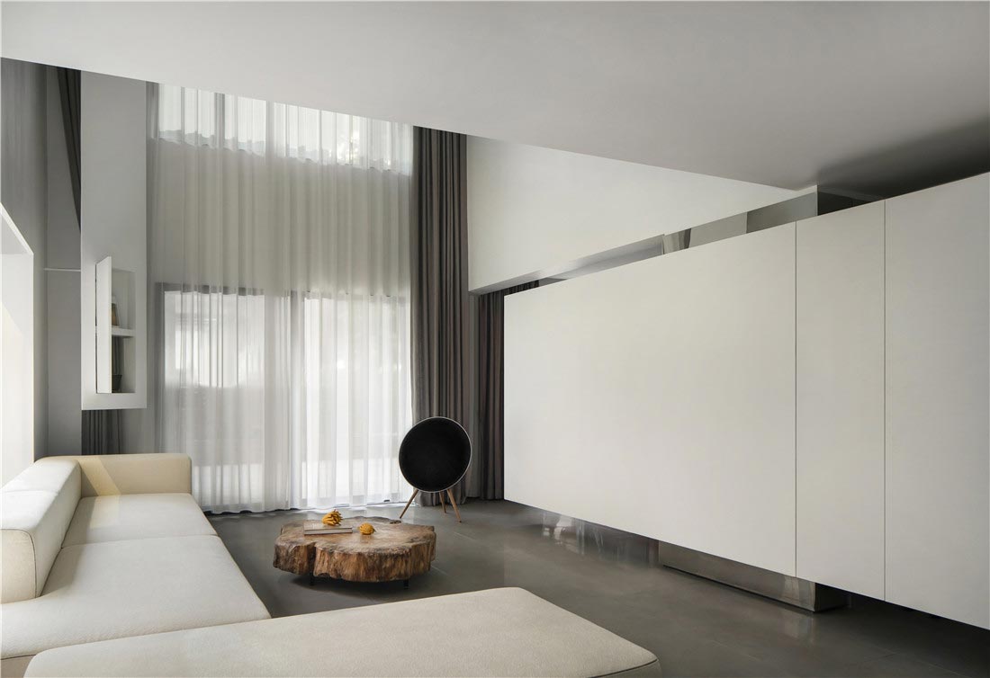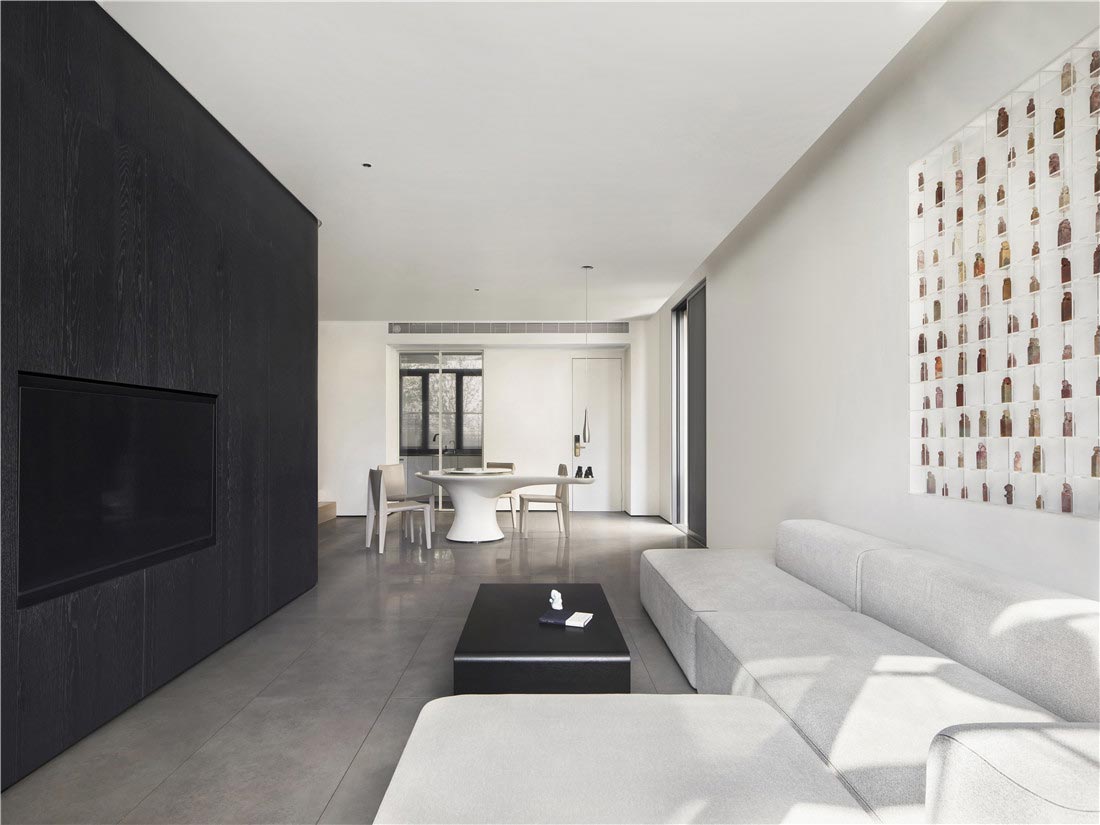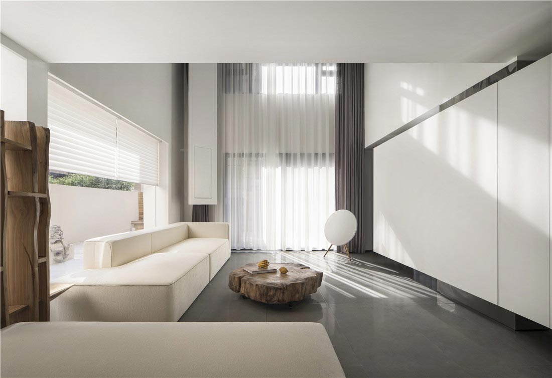 大厅地面运用了灰色素水泥瓷砖,奠定自然朴素的空间基调,减低视觉重点,留下足够的设计自由度。素白沙发与白色饰面系统家具提亮空间,营造简约、清新的统一视觉。