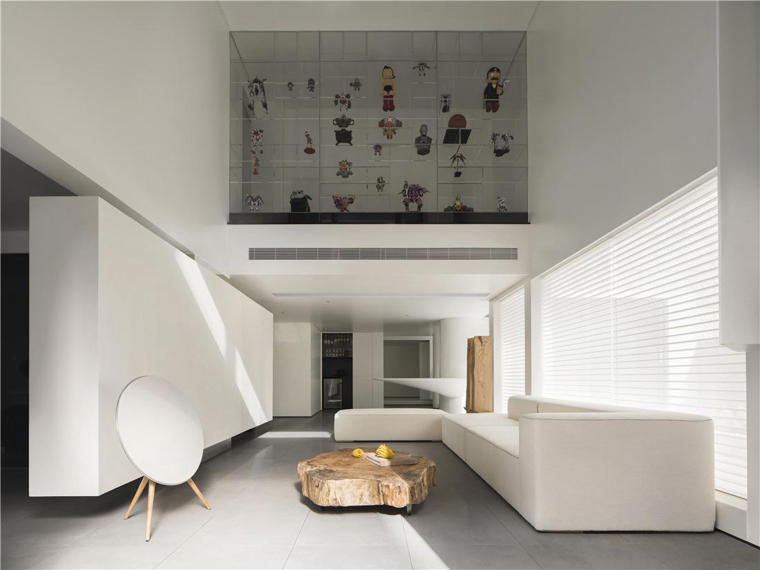 /“背有靠山”,依山而坐,沙发背景墙让前行也多了几分笃定。亚克力透明的展示柜,来自世界各地的手办与雕塑,生活的趣味在此开启。大厅地面用砖:素水泥 | SFT12605MP原石面产品。