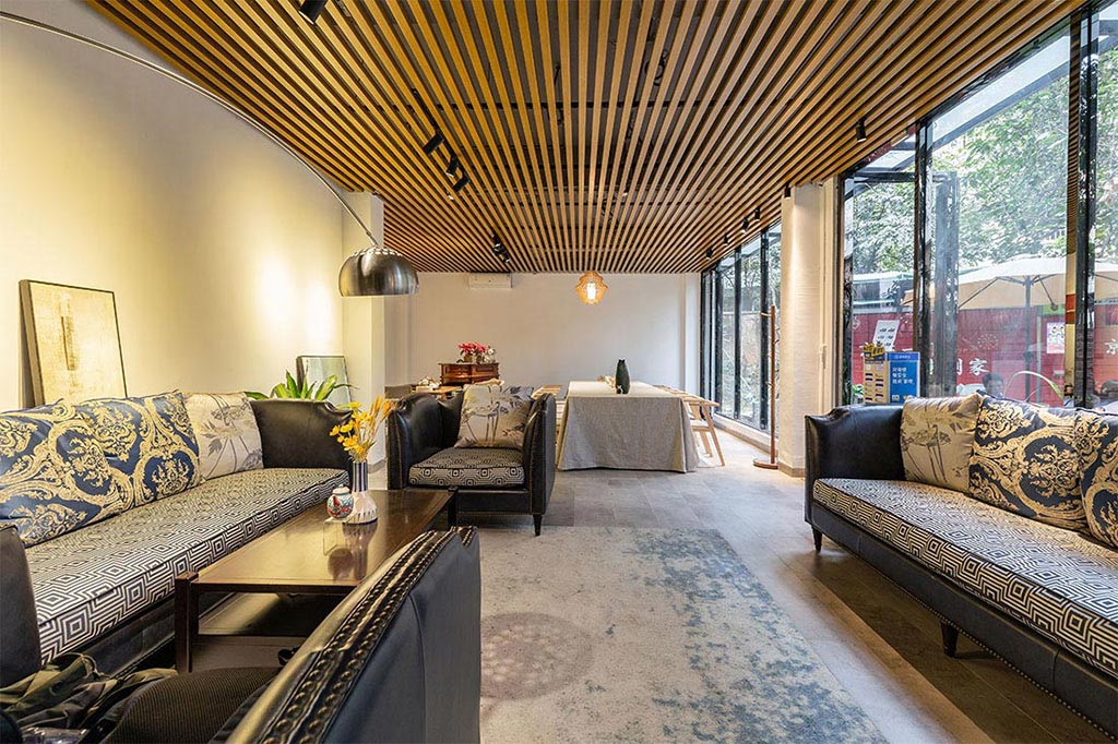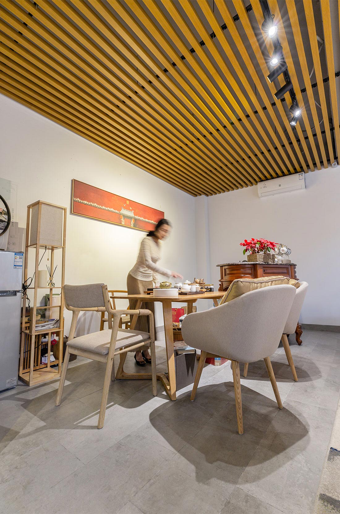 一楼的活动区放置了一张原木长桌和圆桌茶桌,另一处则是美式乡村布艺沙发、欧式复古留声机、加上皮的当代长凳,让区域围合,成为一个喝茶、谈心、阅读、发呆融于一体的地方,在这里来自四方的客人可以拉进彼此的距离,即舒适又随性。