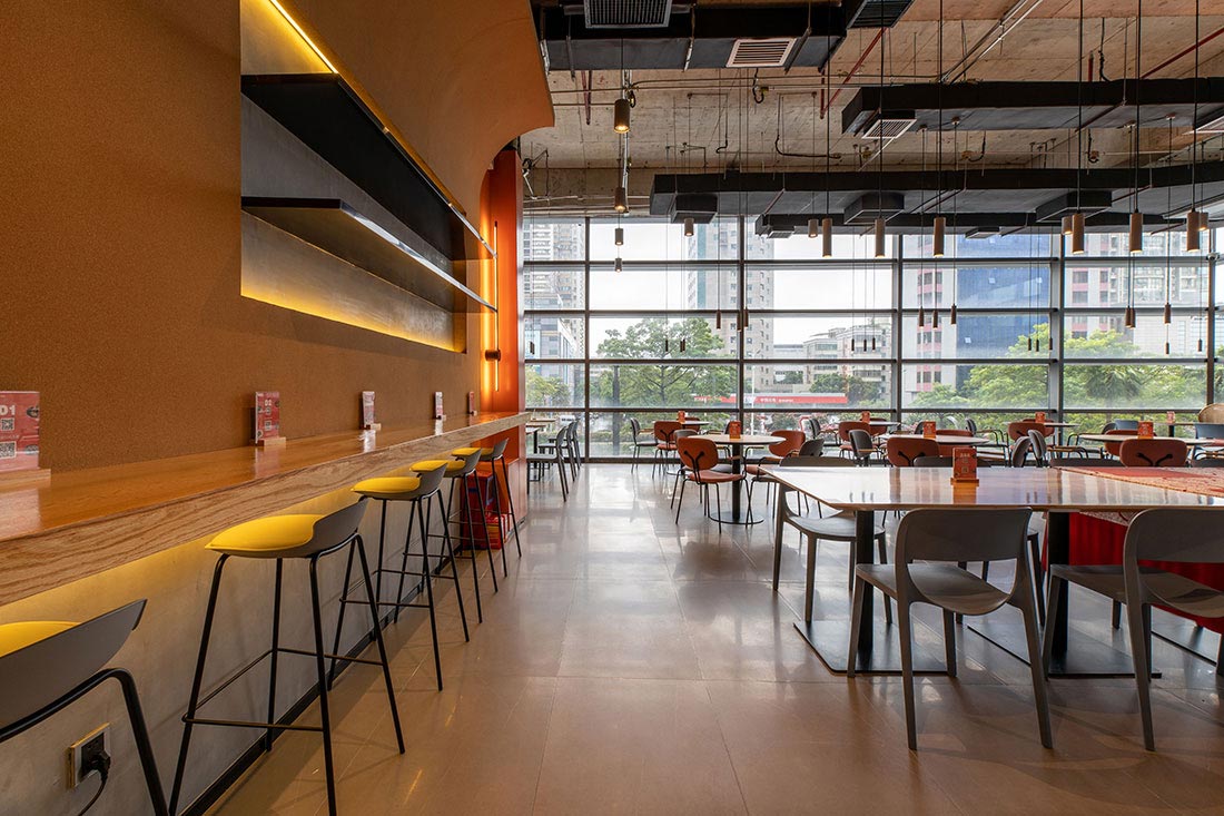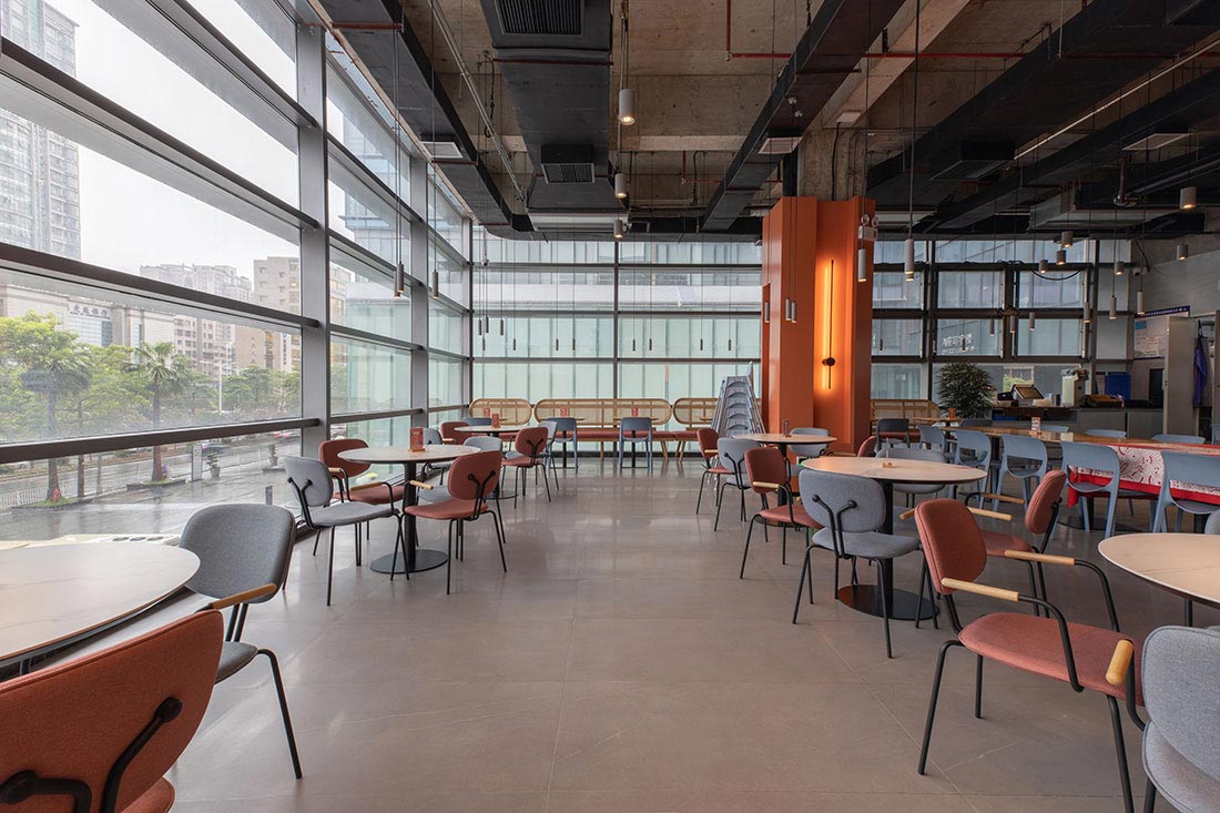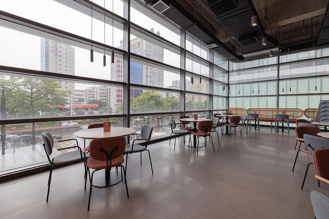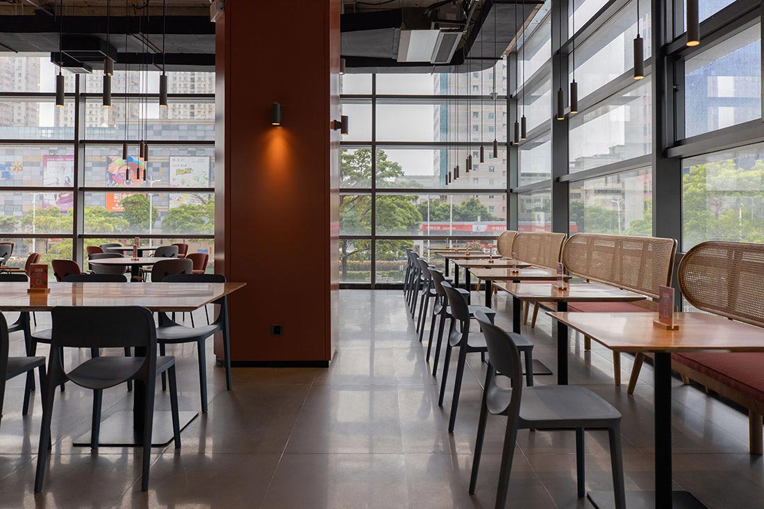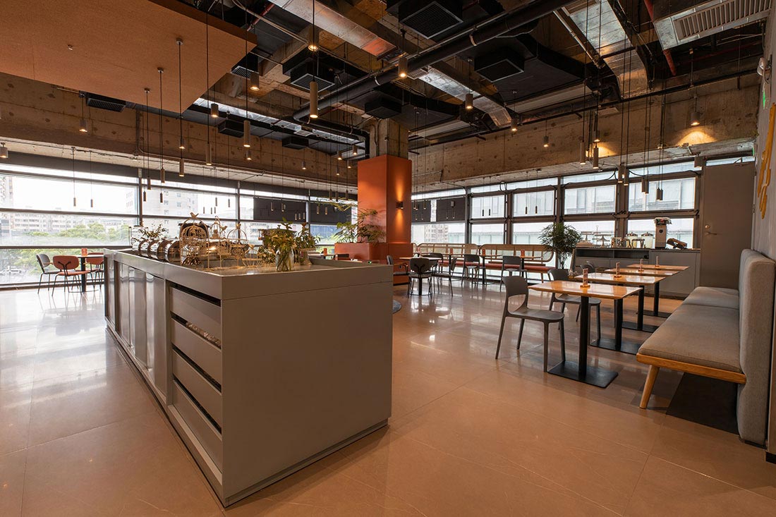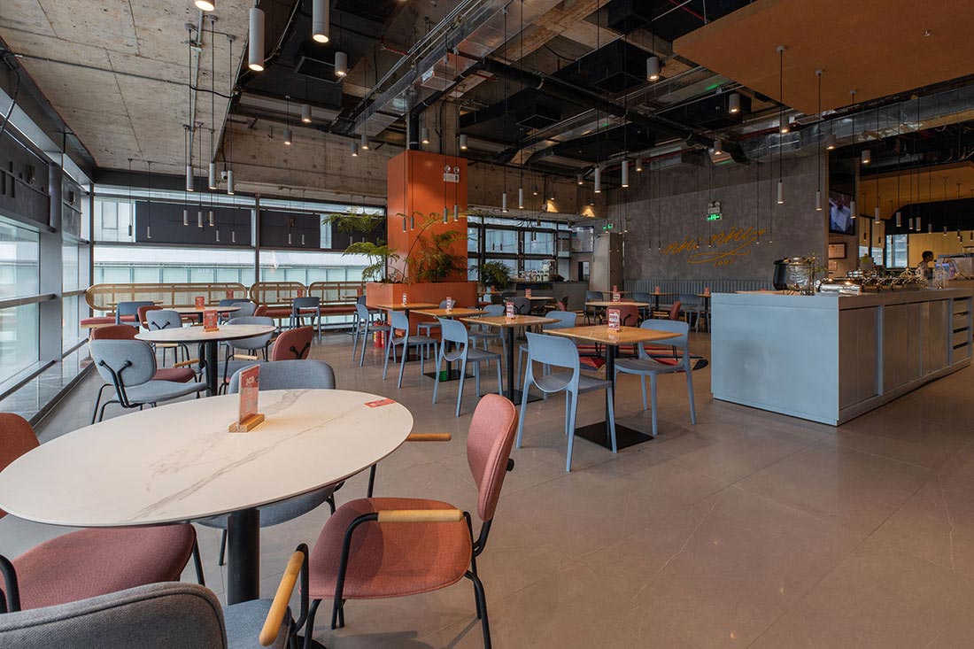 品牌餐饮空间被分至万科金融中心的2层、3层,根据功能属性划分,2层为开放式简餐,3层则为专一性的团体聚会、交际餐饮空间。自然愉悦的空间氛围,美味以飨附近办公大楼的工作者,慰劳人们早已辘辘作响的胃,让人暂时性逃离身边繁杂、苦恼的琐事,烦闷忧愁的心情也将会得到纾解。