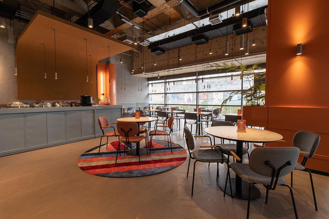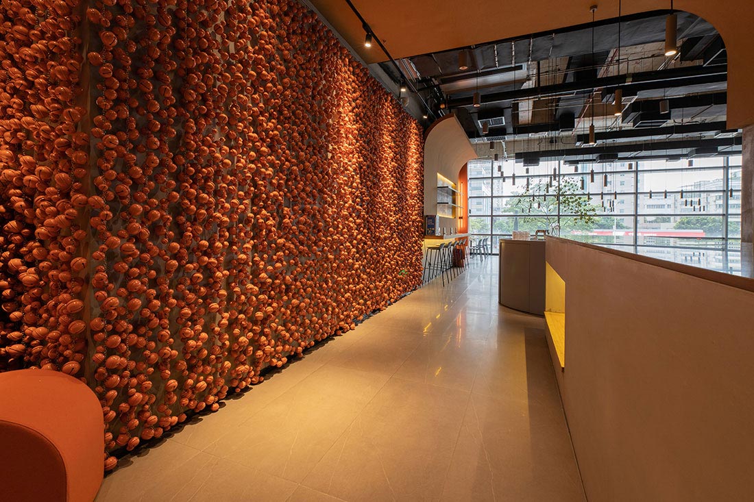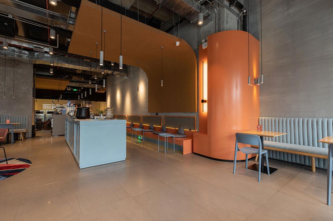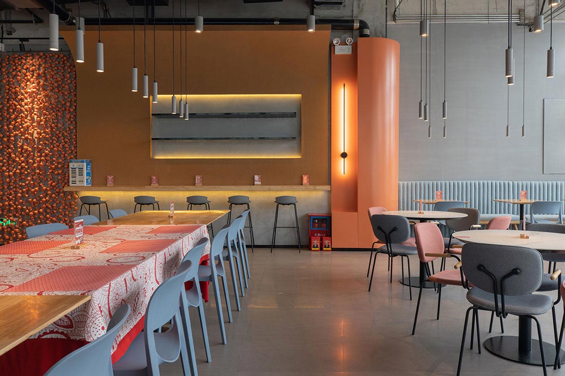 由橙色铃铛引领步入2层室内,空间中的暖色光线通过橙色肌理墙面所产生的漫射,让墙地面和材质随着人的视角变化时而模糊时而清晰,空间氤氲着温柔浪漫的氛围,每个人都被美食及空间治愈着。