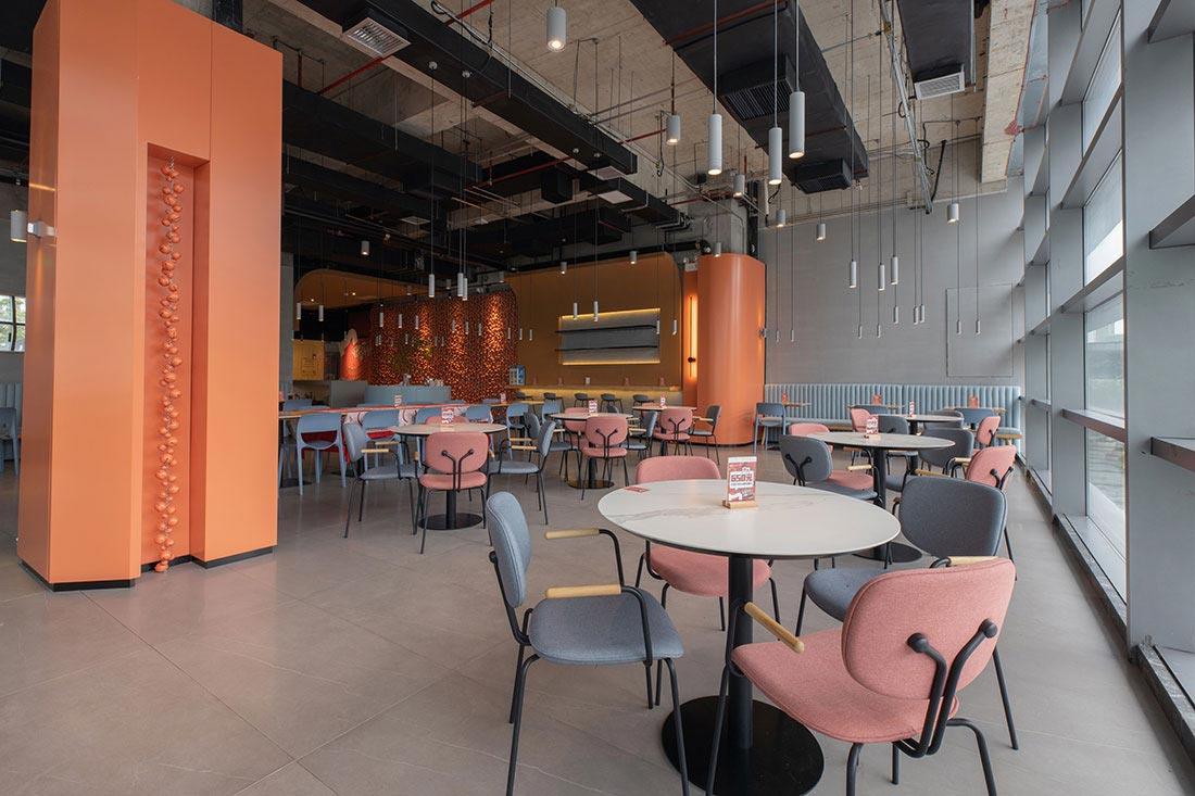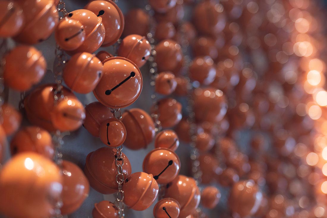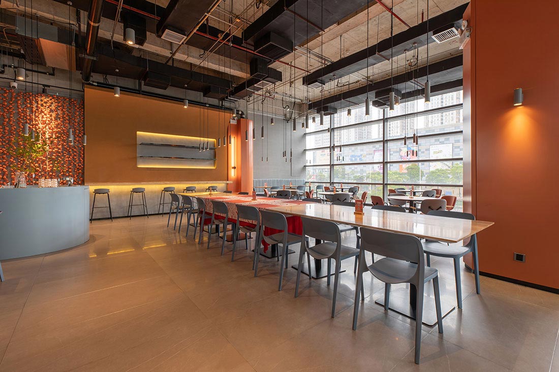 2层进门墙面由多组橙色的铃铛串组成,“铃,铃,铃”的声音把我们带到这里,在这里相遇、在这里相聚、在这里派对……空间色调的选择与灯光搭配应用,使得整个空间鲜明、活跃,让来就餐的人感到放松和愉悦。