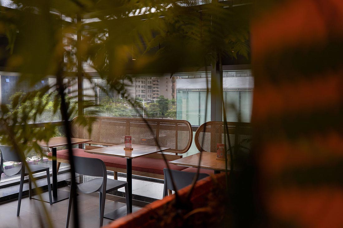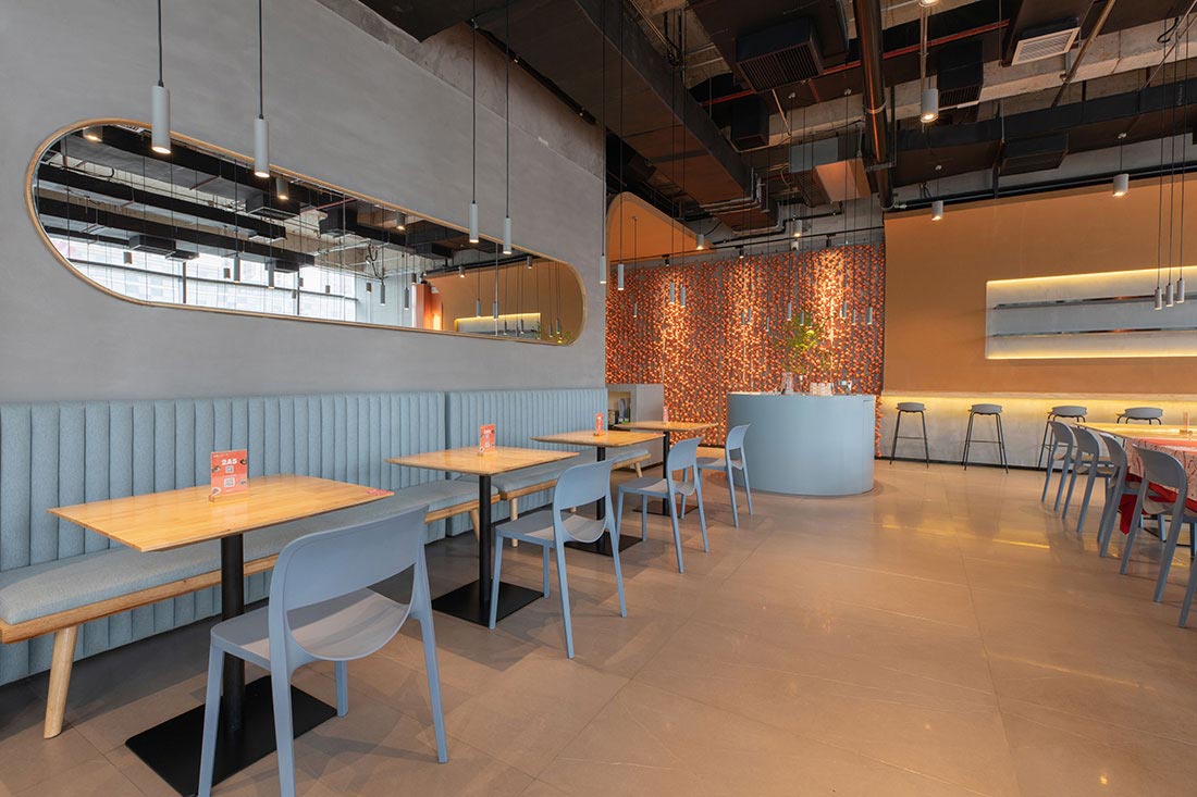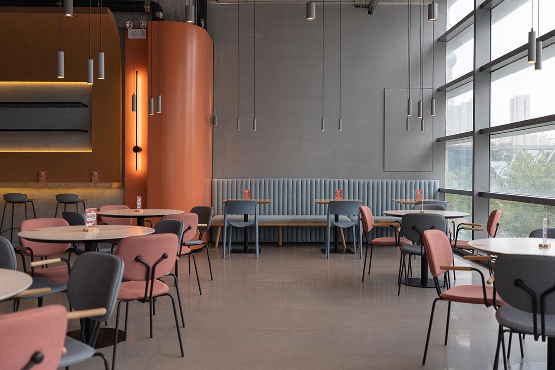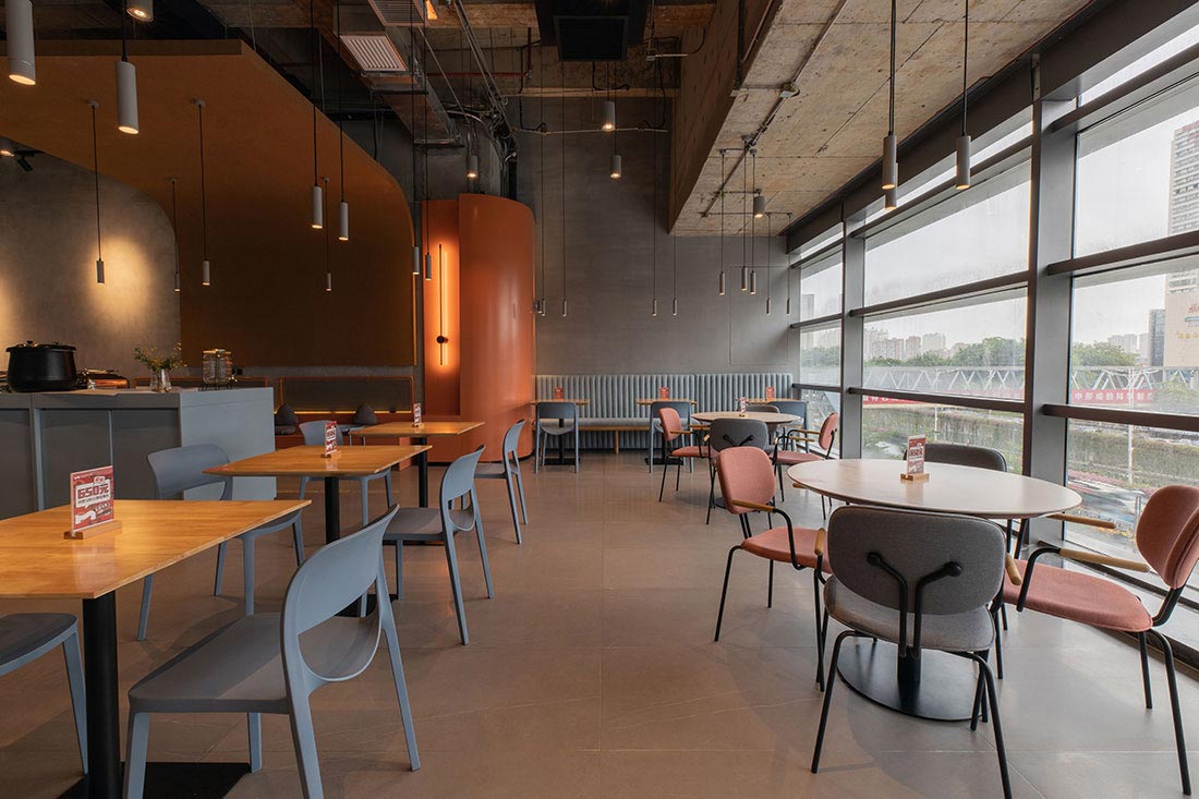 空间中充满活力的橙色,是延续牛牛西厨的品牌主色系,与自然界的大地灰、天空蓝相融合,三种颜色分别在墙地面、桌椅、饰件中互相呼应,视觉感官捕捉的欢愉触动我们的共鸣,透过玻璃传导到更远的地方。