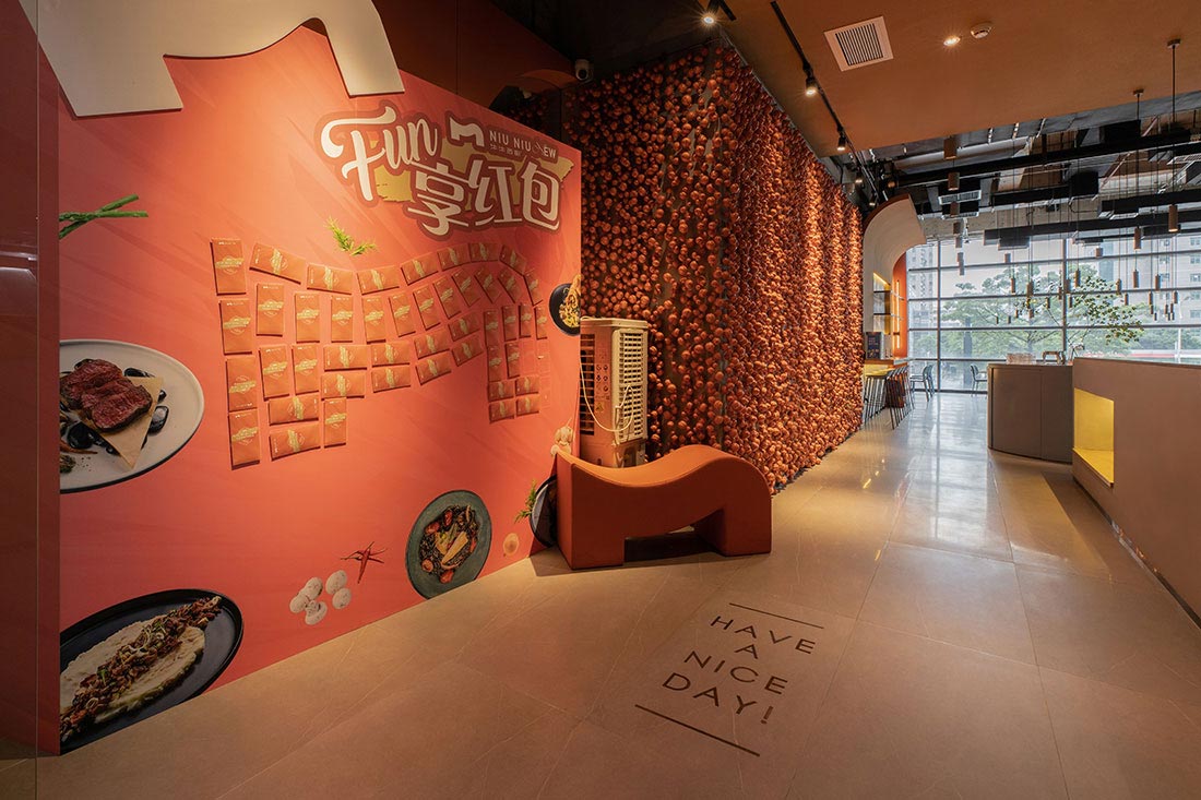 NIU NIU·NEW是牛牛西厨面对年轻市场全新打造的中西融合菜子品牌,位于佛山万科金融中心,周边是林立的建筑大楼,空间通过巧妙设计,呈现多向度的自然感。设计师重新加强对自然界敬畏的理念,把品牌色系更赤裸地展示出来,品牌的形象以更直接轻松的方式与我们互动、对话。