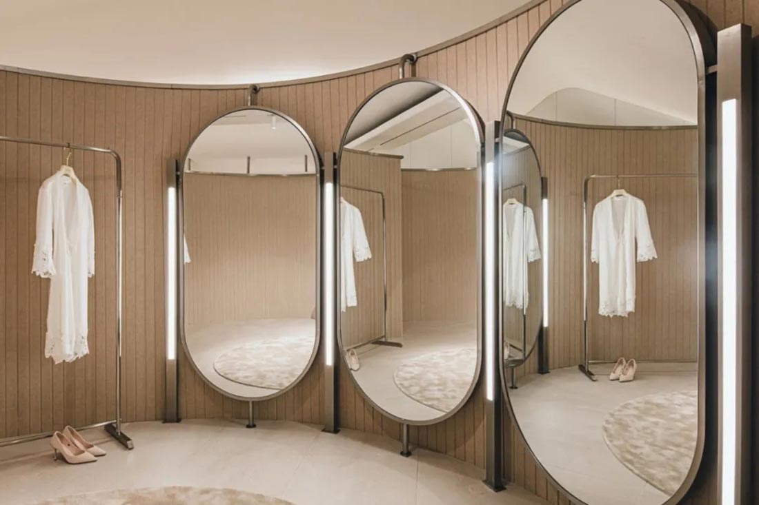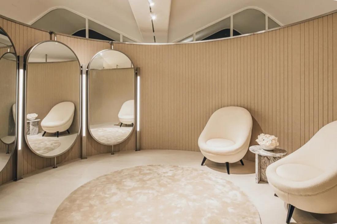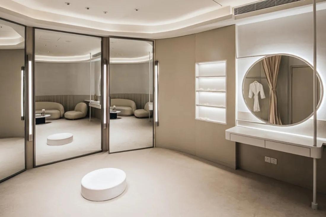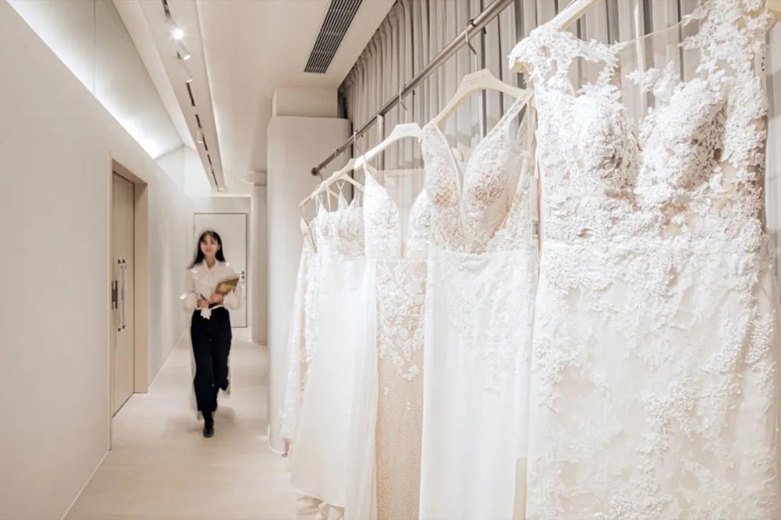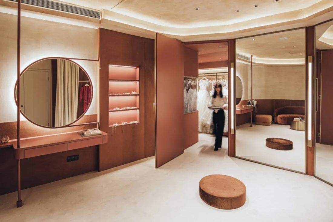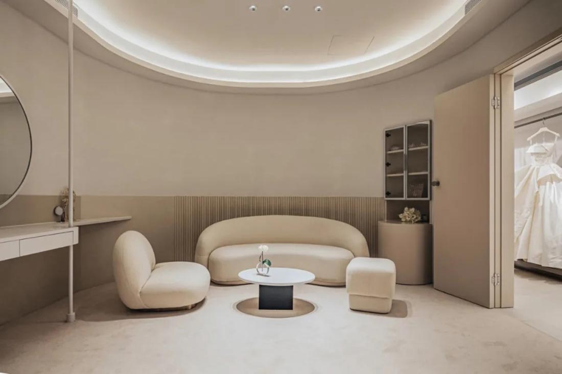 整体材质颜色与婚纱素白色调保持一致,围造柔和纯净的空间氛围来增加试纱的仪式感,让每个来到这里试纱的人成为空间的主角。