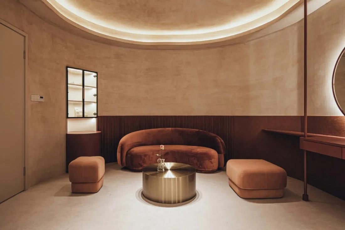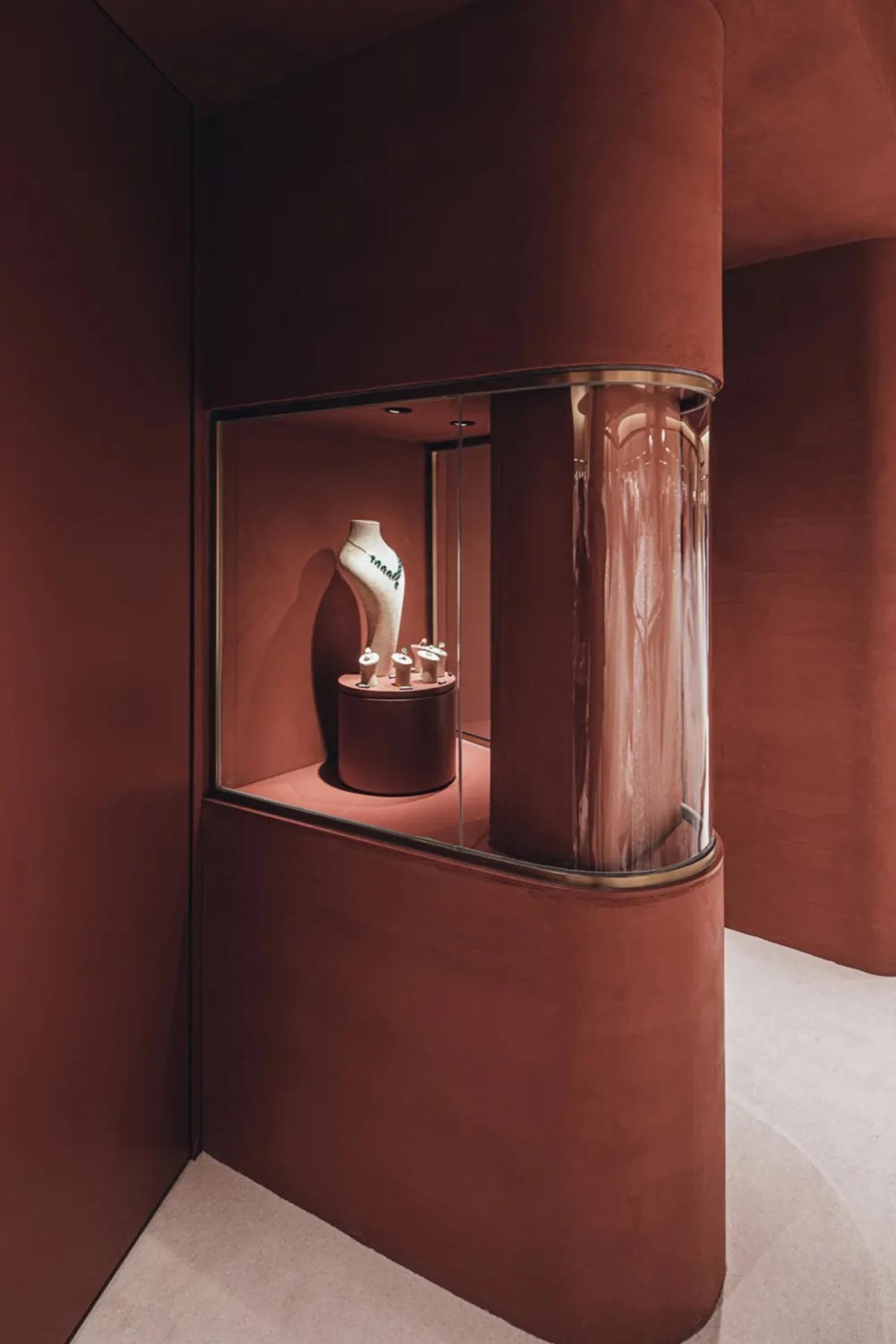 柔软触感的地毯搭配木的朴素质感,营造潮流时尚的空间体验;极简艺术白的格调,营造简洁大方的优雅韵味;高饱和度的复古系,彰显质感的分量。从地面水磨石碎粒与砂岩相融的细石粒瓷砖,暗示着材质细节美感,到珠宝首饰的精美度、地毯的柔软触感。空间中所有的材质留给使用者特有的记忆,散发着自己的魅力。