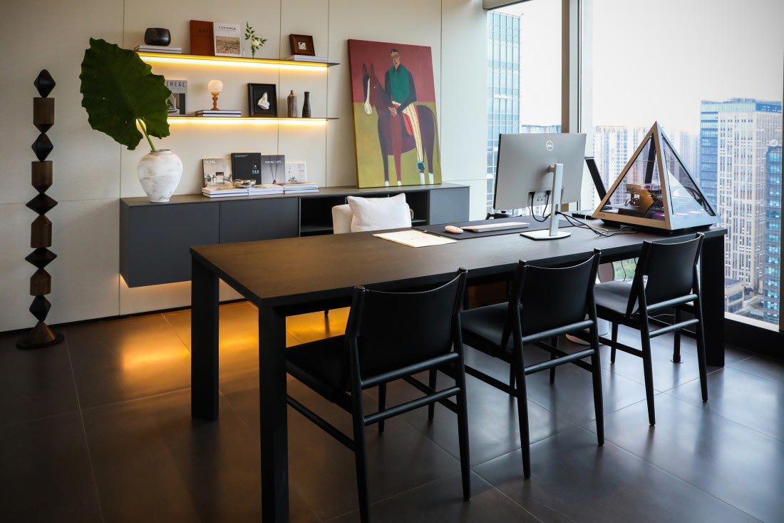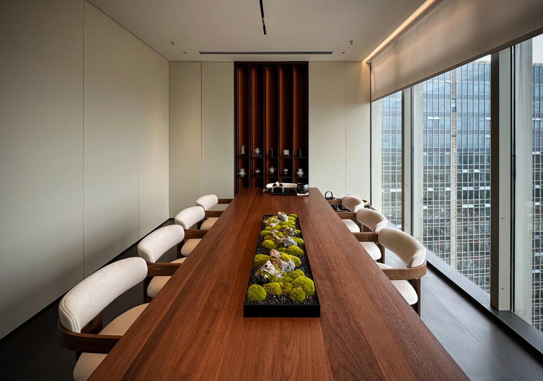 当空间变得开阔整洁时,家具的质感就显得颇为重要。一张简洁的会议长桌,完全能撑起气场。当微光洒在温润的木材表面时,总会拨动心弦,叫人感到暖意。