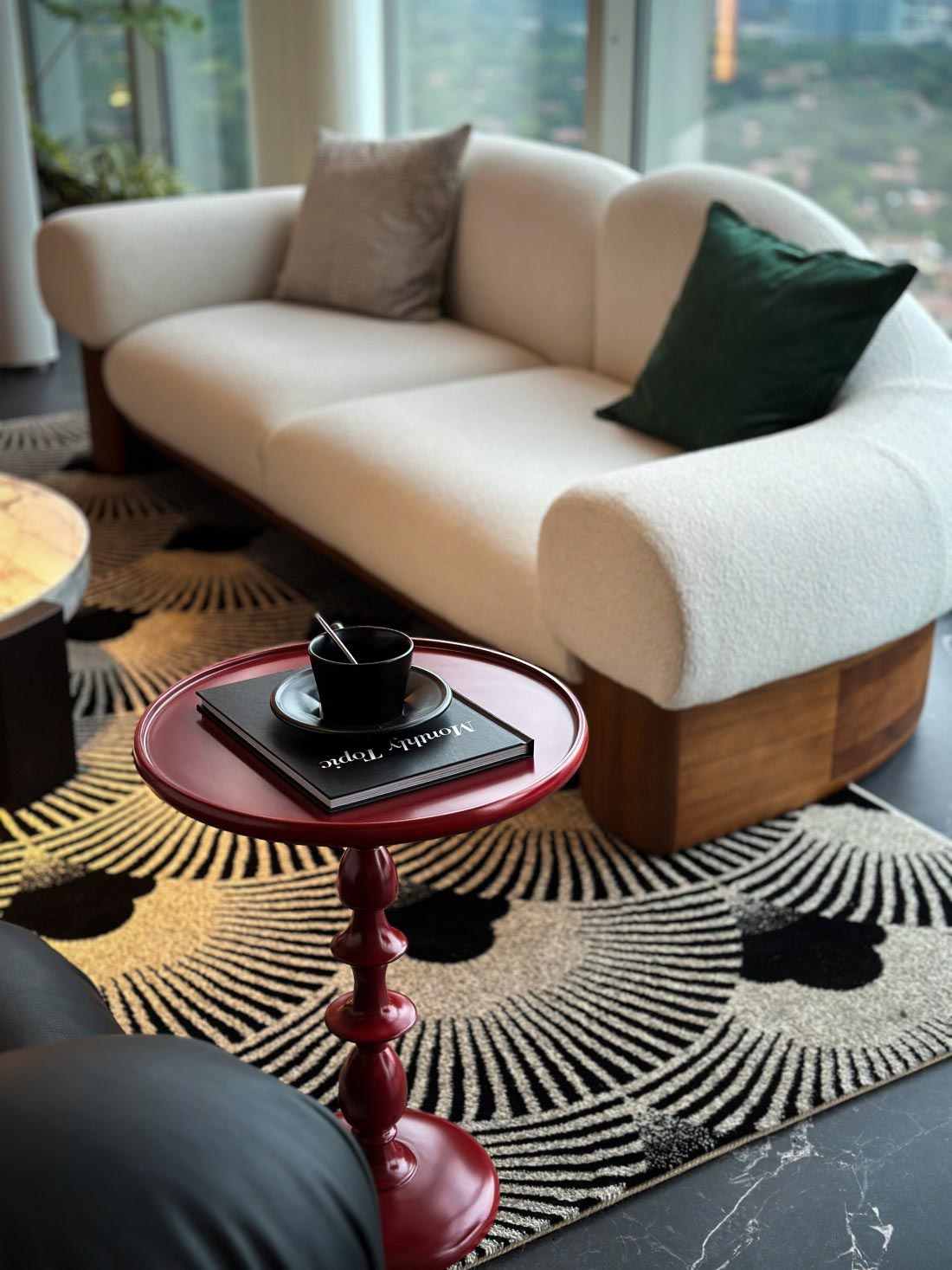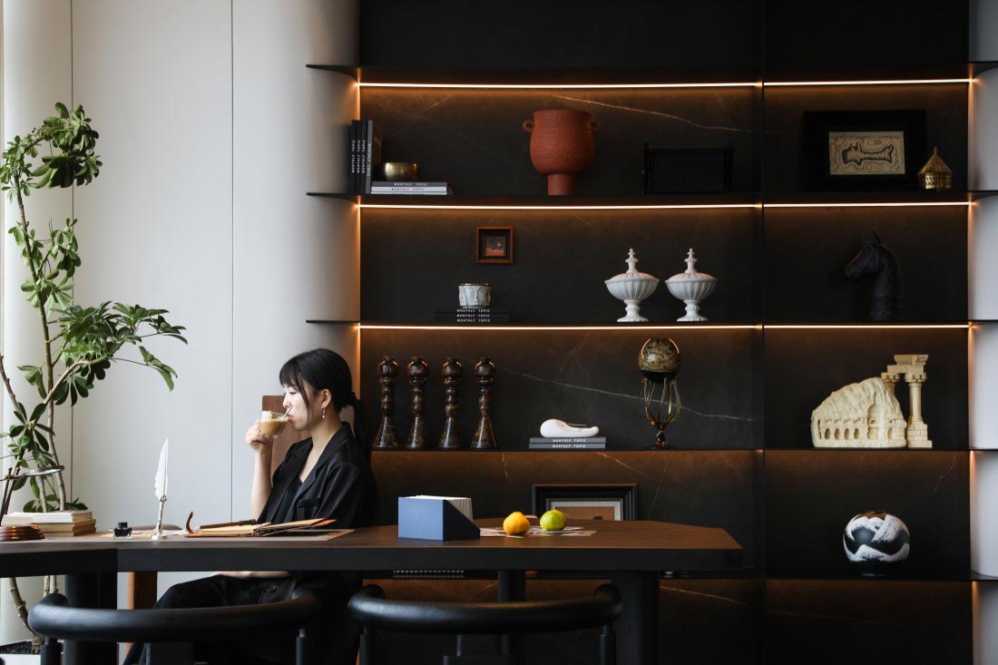 设计师在空间增加绿色、红色等暖色调的点缀,降低了整体色调的冷酷感,让炭黑色「MLB大理石12610M」不再孤单。