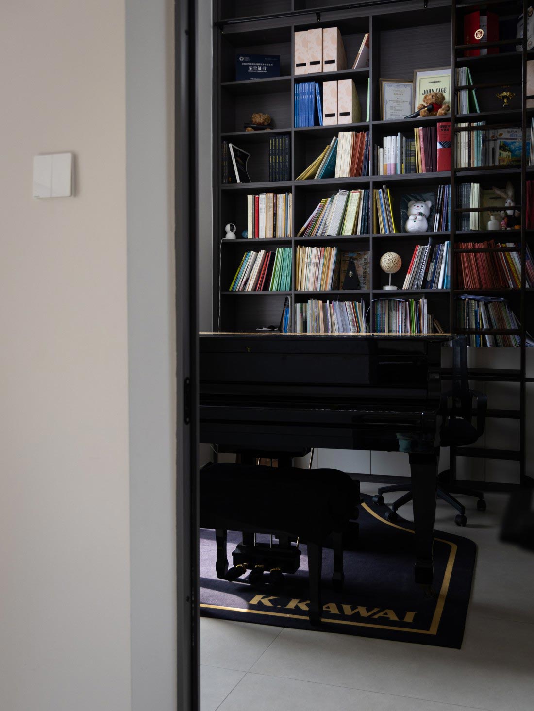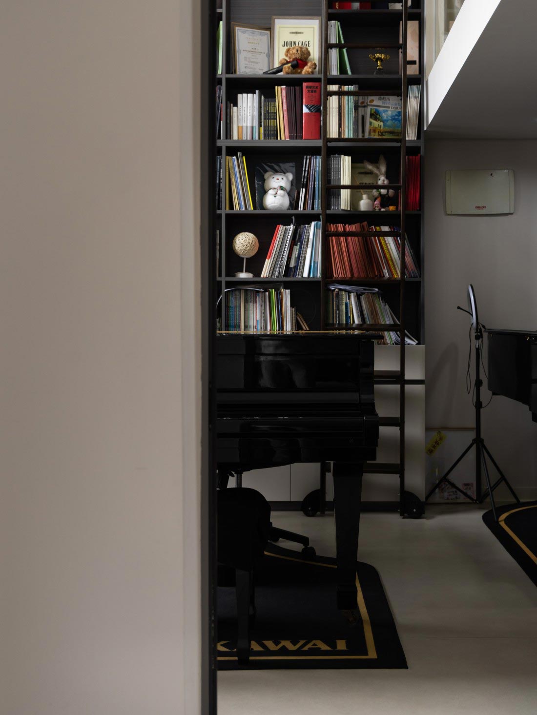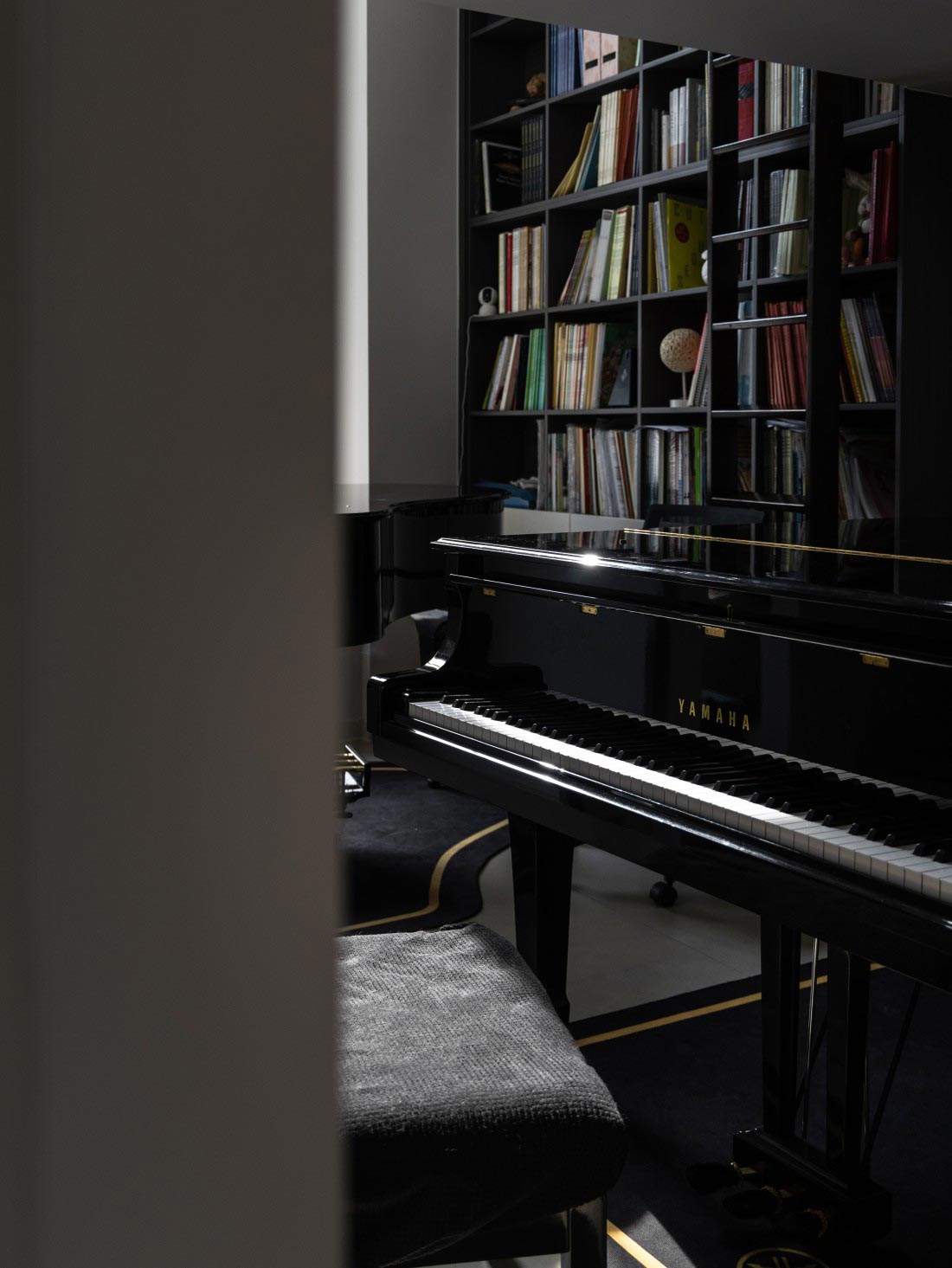书架的摆设延伸至二楼,如同为立式钢琴打造装饰性的壁。钢琴在丰富多彩的黑白色氛围装饰中看起来像找到了自己的归宿一样,无处不散发典雅气质。