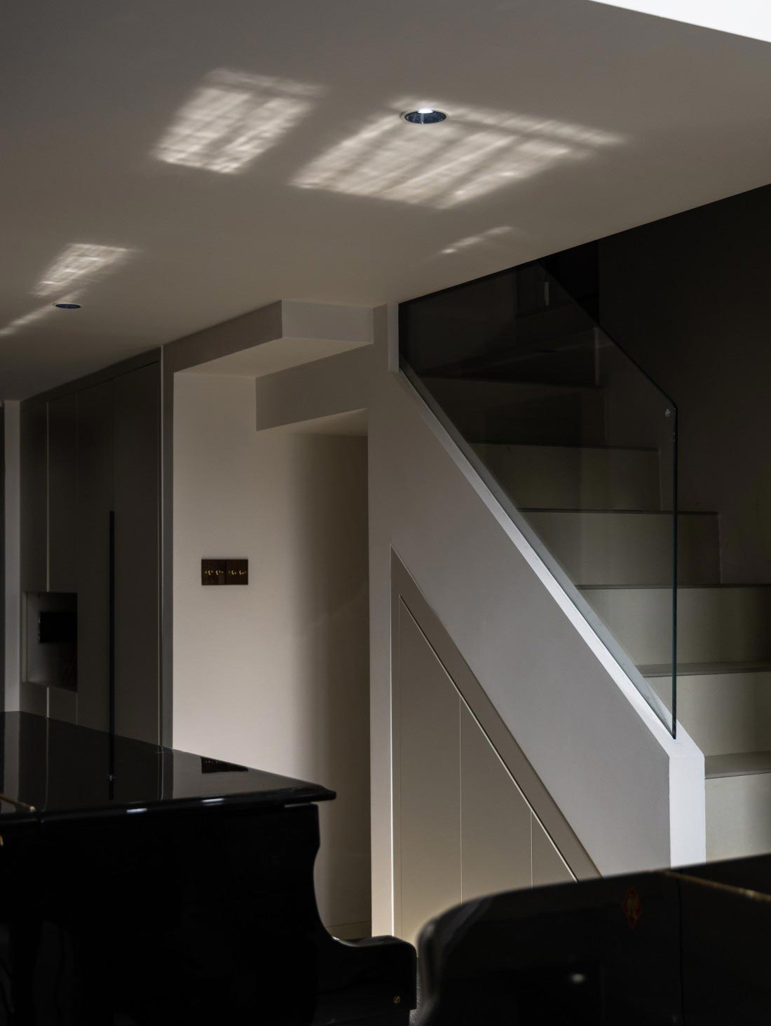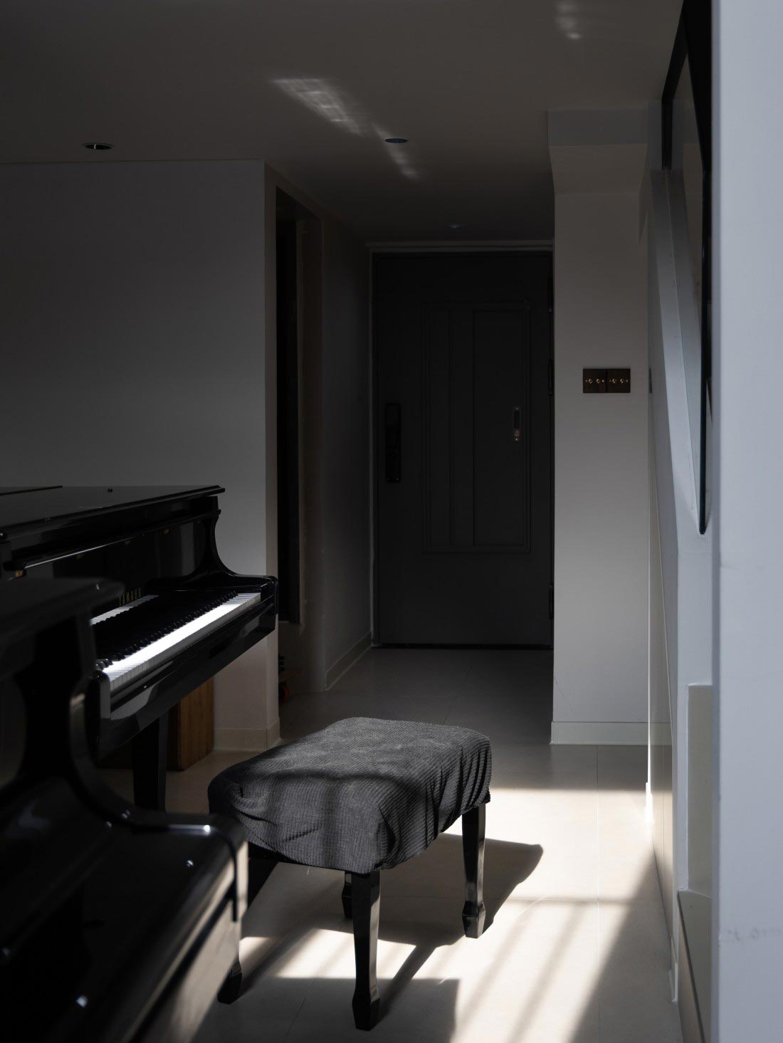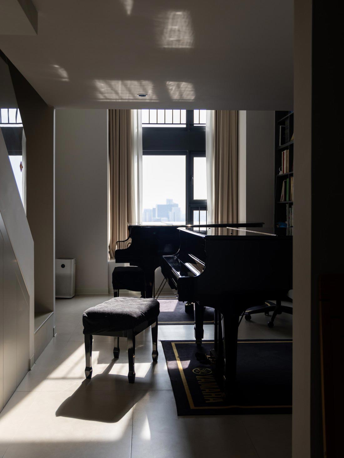 书架的摆设延伸至二楼,如同为立式钢琴打造装饰性的壁。钢琴在丰富多彩的黑白色氛围装饰中看起来像找到了自己的归宿一样,无处不散发典雅气质。