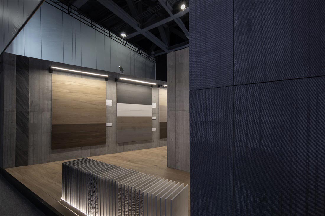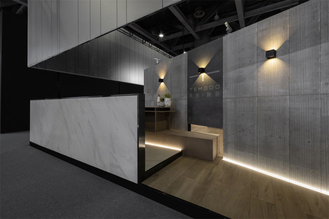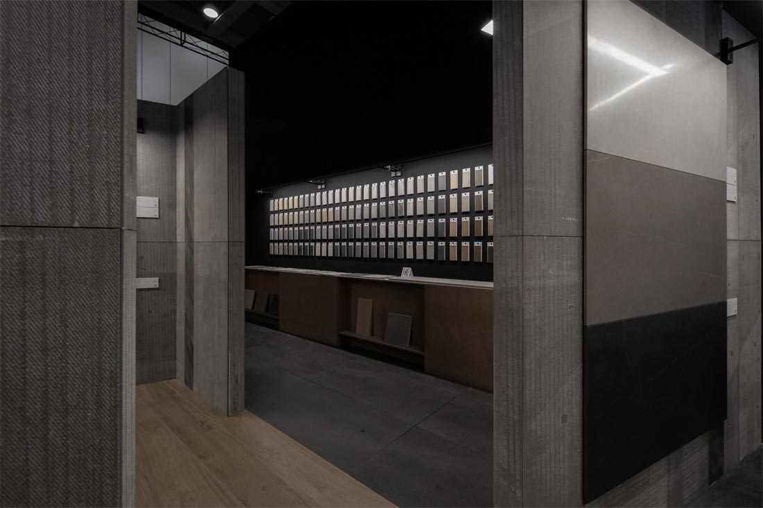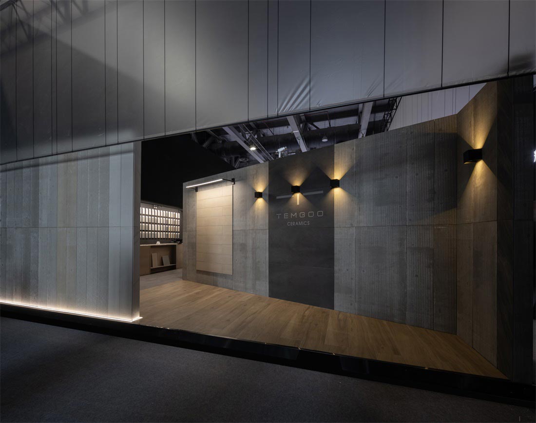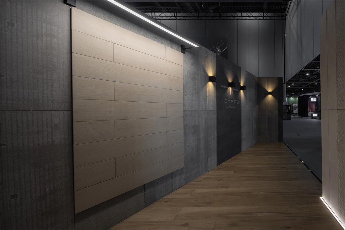 砖背为空间墙体装饰面,砖正面铺贴在墙体,肌理为点缀,形成了整个展位设计的视觉基调,不同的材质肌理细节在空间中放大,于宽敞空间中自然延伸,极尽视野开阔的享受。而细微之处传递出充满爱与热忱的氛围,一件件瓷砖产品成为让人感到惊喜又引发情感共鸣的作品。