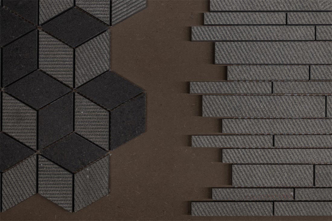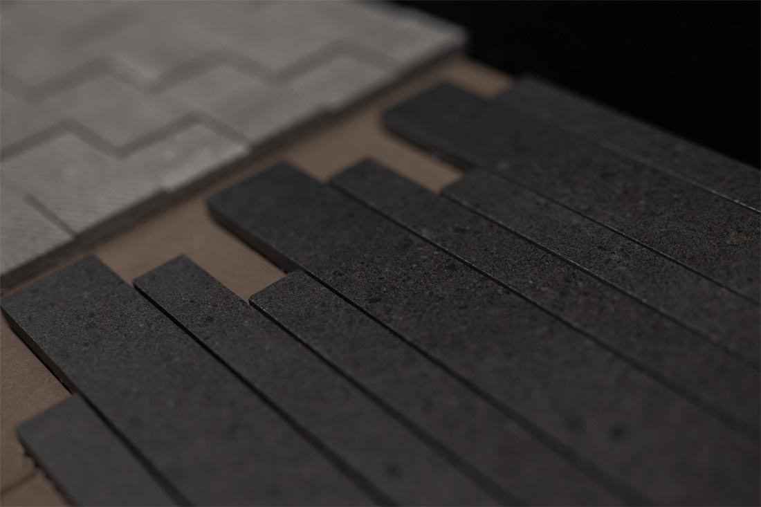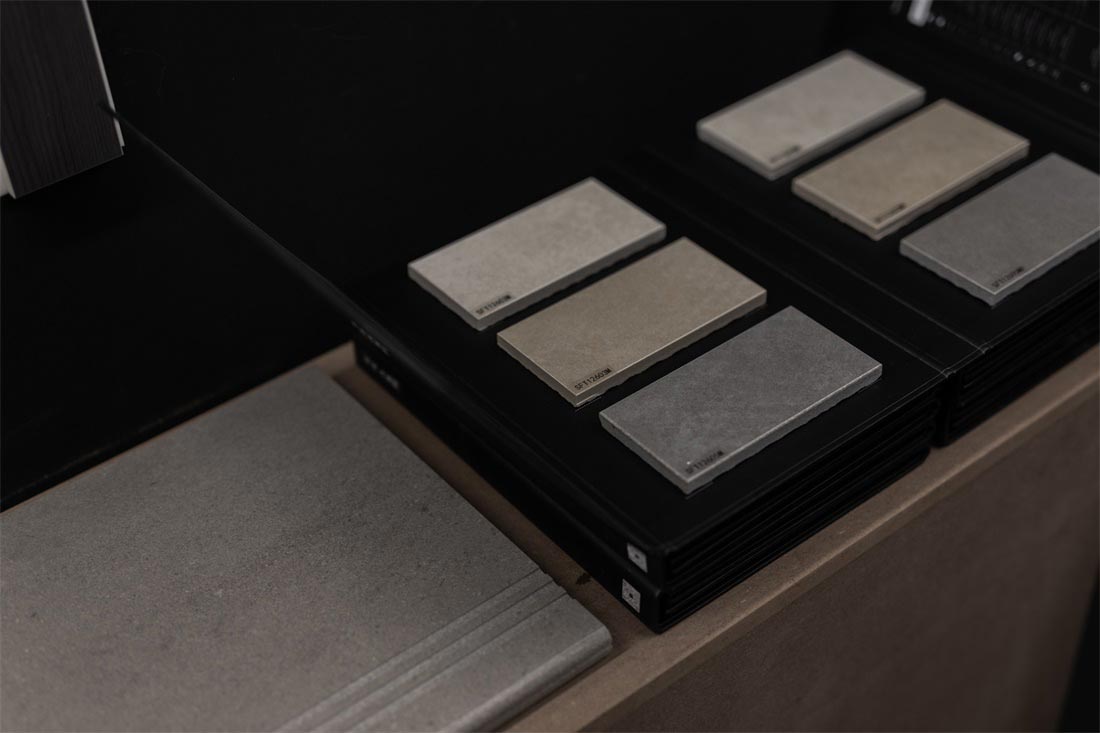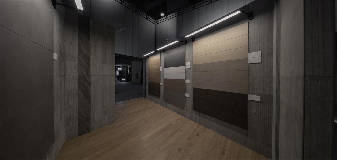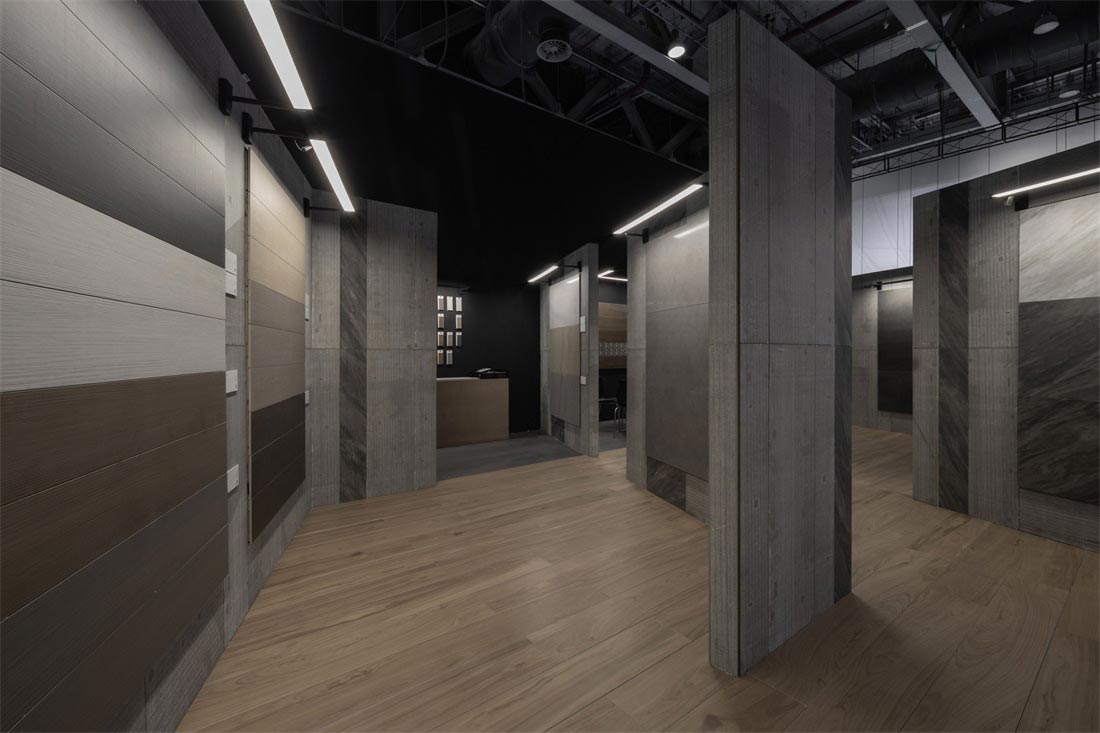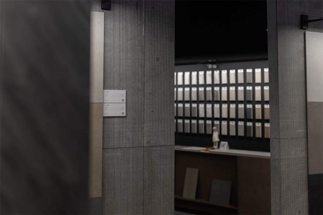 砖背为空间墙体装饰面,砖正面铺贴在墙体,肌理为点缀,形成了整个展位设计的视觉基调,不同的材质肌理细节在空间中放大,于宽敞空间中自然延伸,极尽视野开阔的享受。而细微之处传递出充满爱与热忱的氛围,一件件瓷砖产品成为让人感到惊喜又引发情感共鸣的作品。
