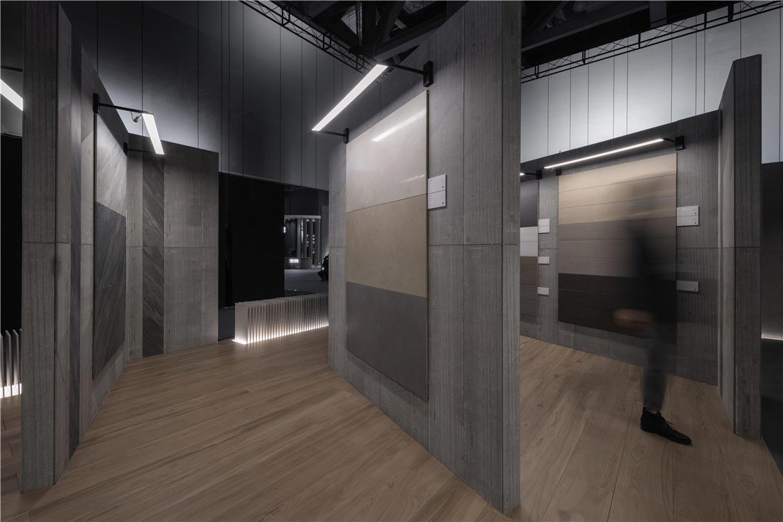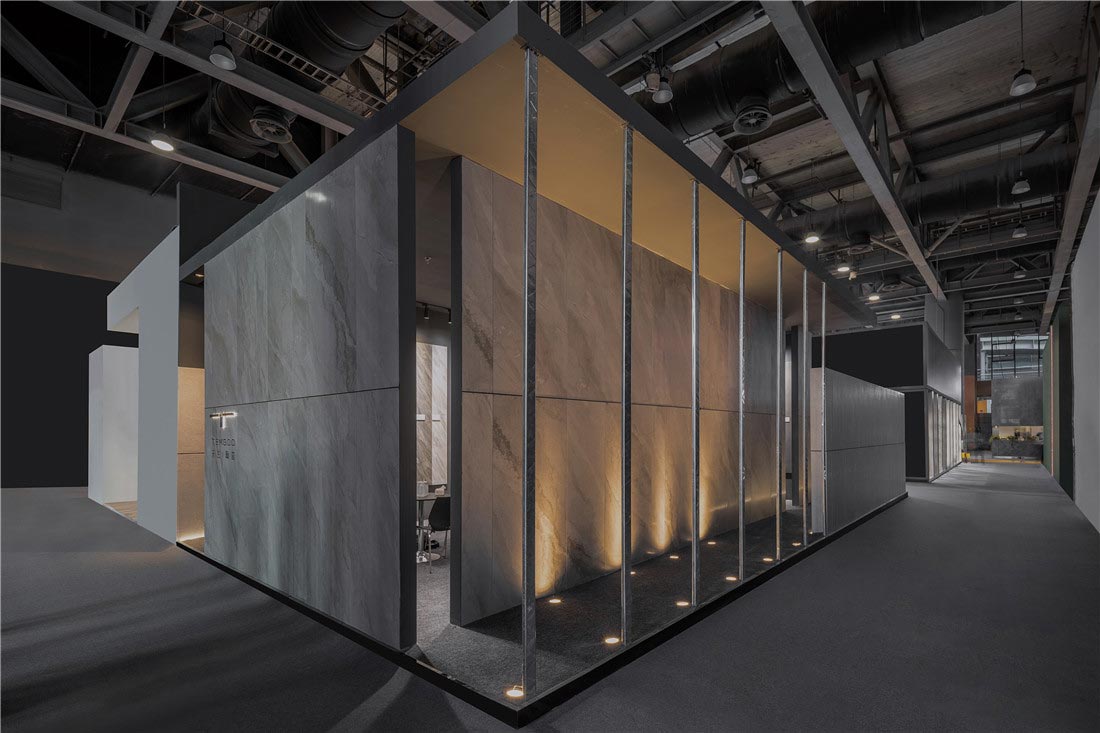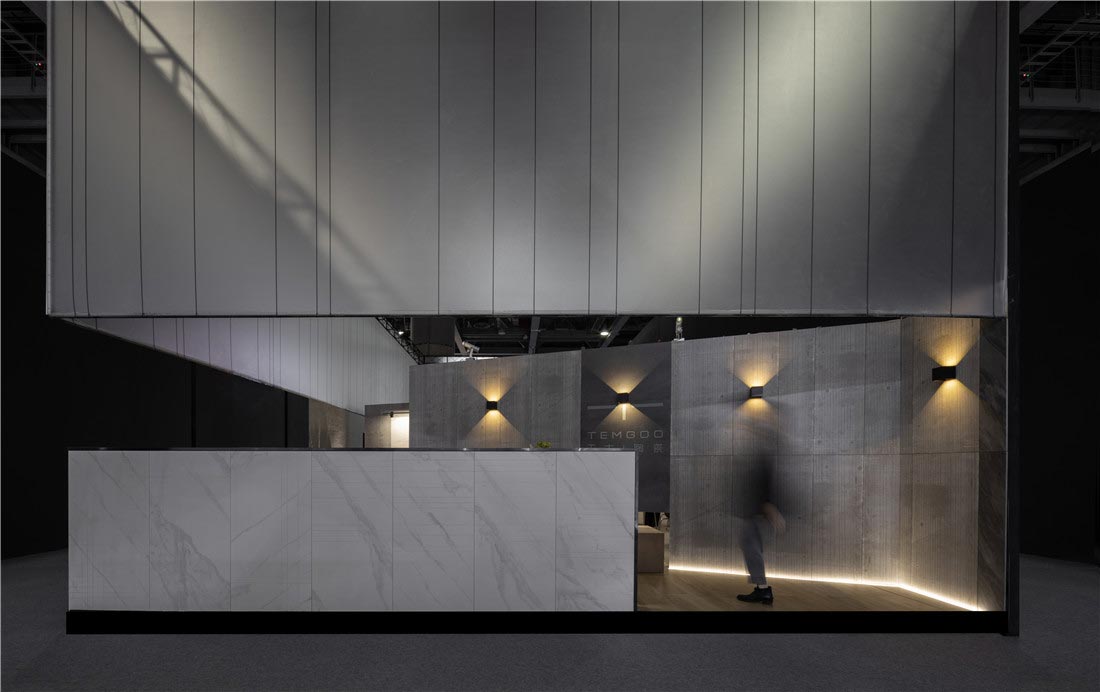 把展位设计为连续的空间,使得区域之间没有明确的界限,用建筑空间形式如初新产品在肌理与质感、光泽上的表现,