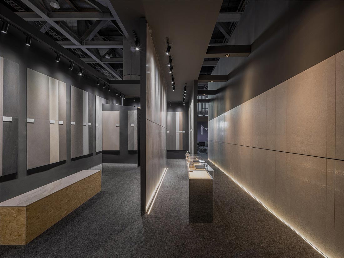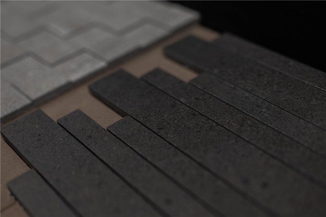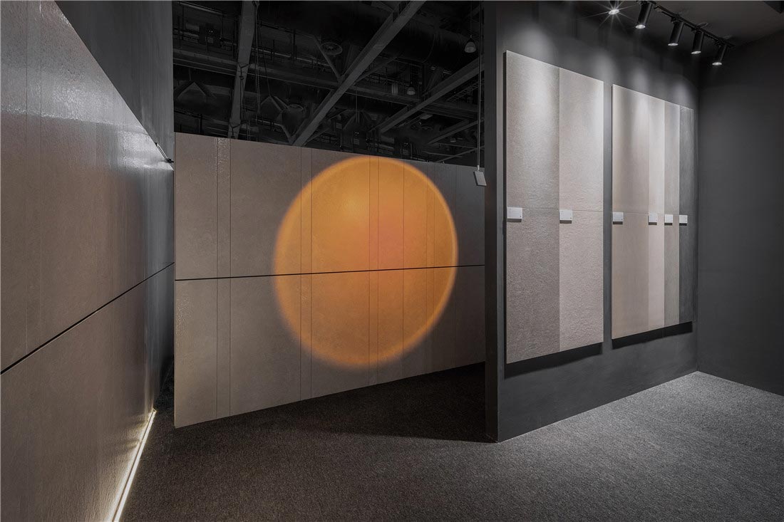 将天古陶瓷产品反过来铺贴,砖背为空间墙体装饰面,不同瓷砖胚体色彩细节在空间中放大,